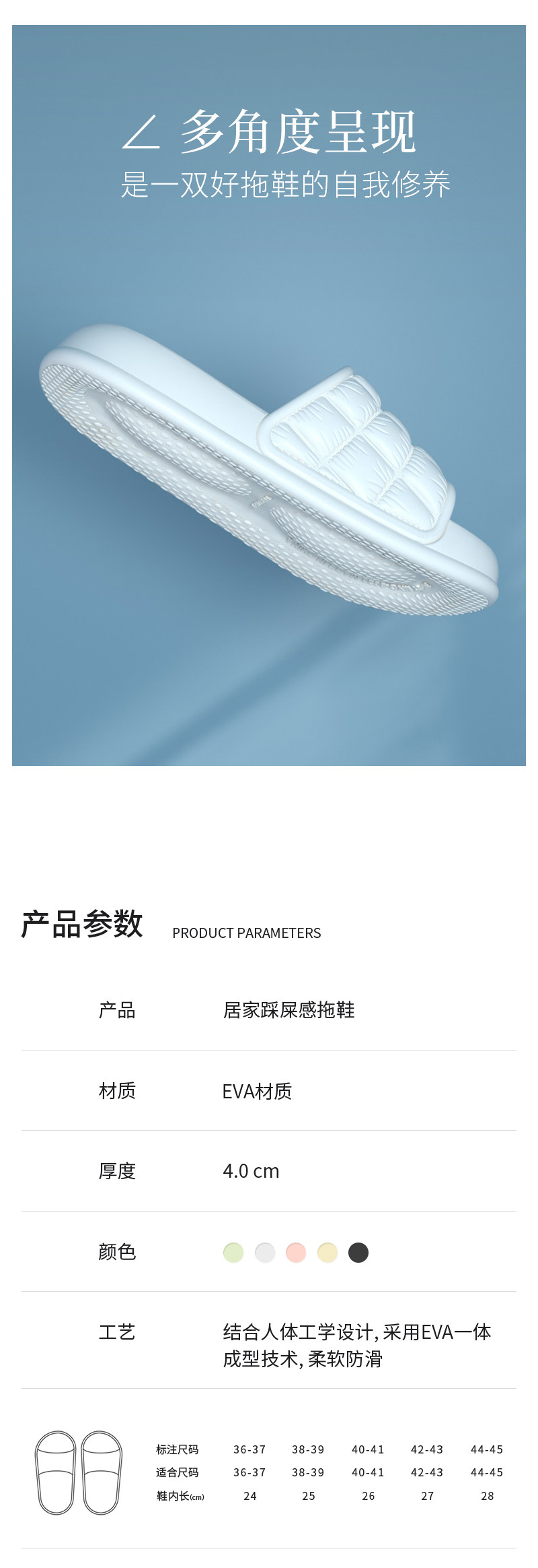- Color classification: white (4.0cm eva material is soft and comfortable), beige (4.0cm eva material is soft and comfortable), green (4.0cm eva material is soft and comfortable), pink (4.0cm eva material) The material is light, soft and comfortable) Black (4.0cm stepping on shit, eva material is soft and comfortable)